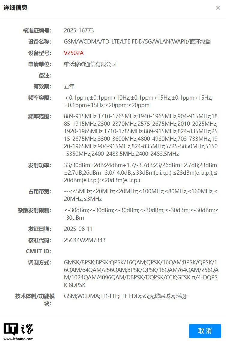本次通过核准的两款设备型号分别为 V2502A、V2502DA,均支持 GSM / WCDMA / TD-LTE / LTE FDD / 5G / WLAN (WAPI)/蓝牙通信,DA 版还支持北斗短报文。
