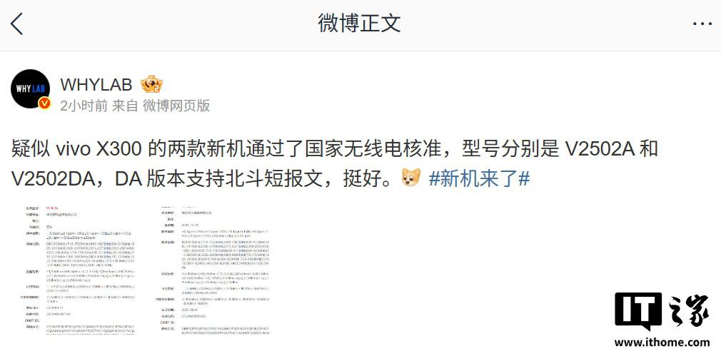 博主 @WHYLAB 今天在微博透露,这两款手机疑似是 vivo X300 系列。